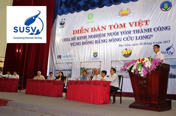 Tại Tp. Bạc Liêu, ngày 28/8/2017. Ban quản lý dự án “SusV” phối hợp với Hội nghề cá Việt Nam, Sở NN&PTNT Bạc Liêu, Tổng cục Thủy sản, Trung tâm Hợp tác quốc tế Nuôi trồng và Khai thác thủy sản bền vững (ICAFIS), OXFAM Việt Nam, tổ chức WWF tại Việt Nam, Trung tâm Khuyến Nông Bạc Liêu, Dự án GRAISEA cùng tổ chức “DIỄN ĐÀN TÔM VIỆT: CHIA SẺ KINH NGHIỆM NUÔI TÔM THÀNH CÔNG VÙNG ĐỒNG BẰNG SÔNG CỬU LONG”.